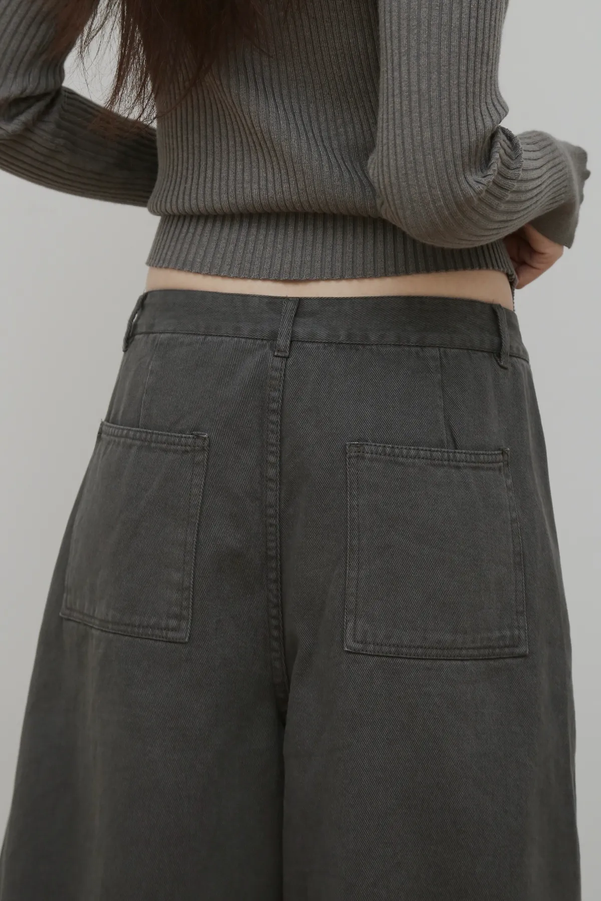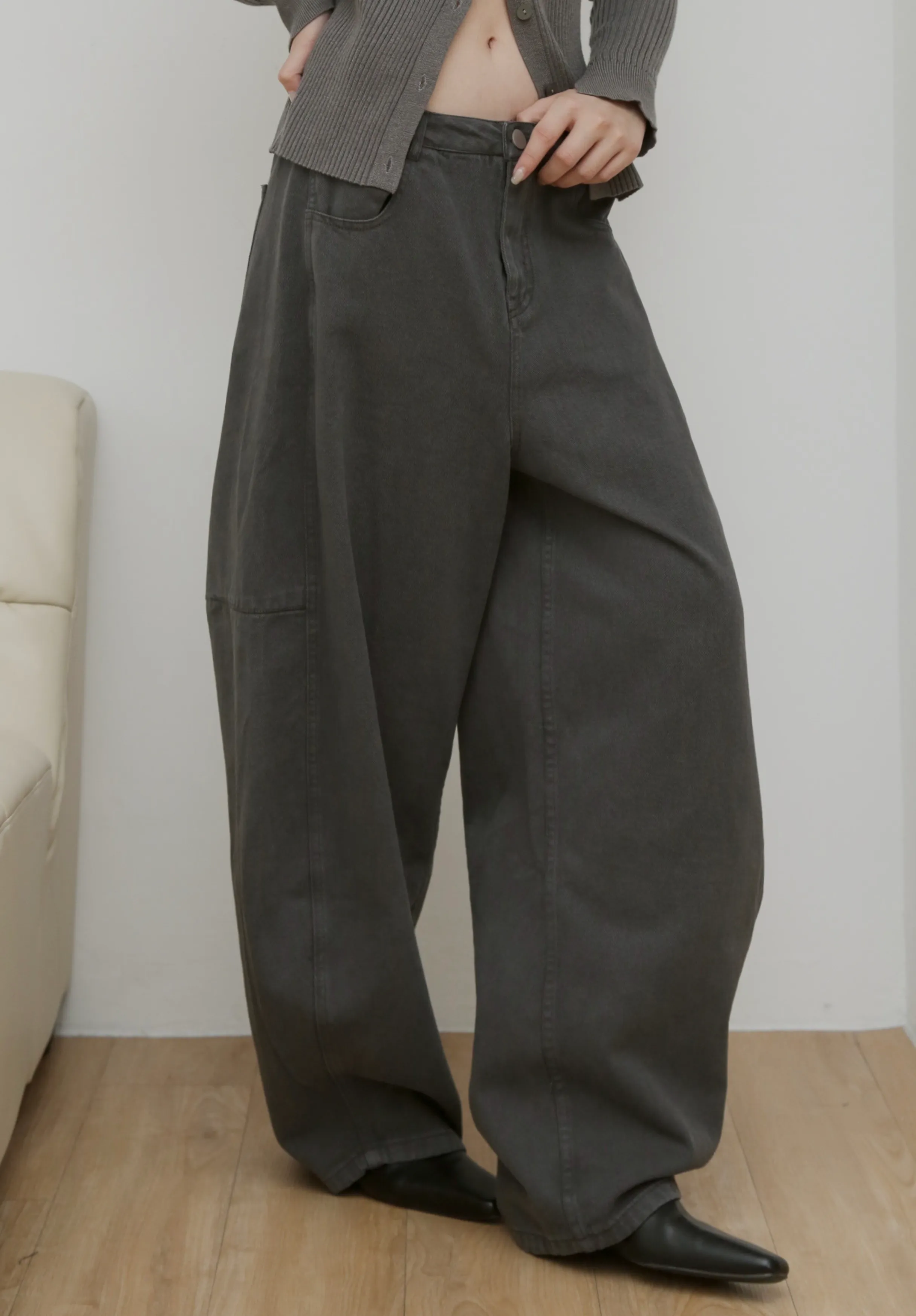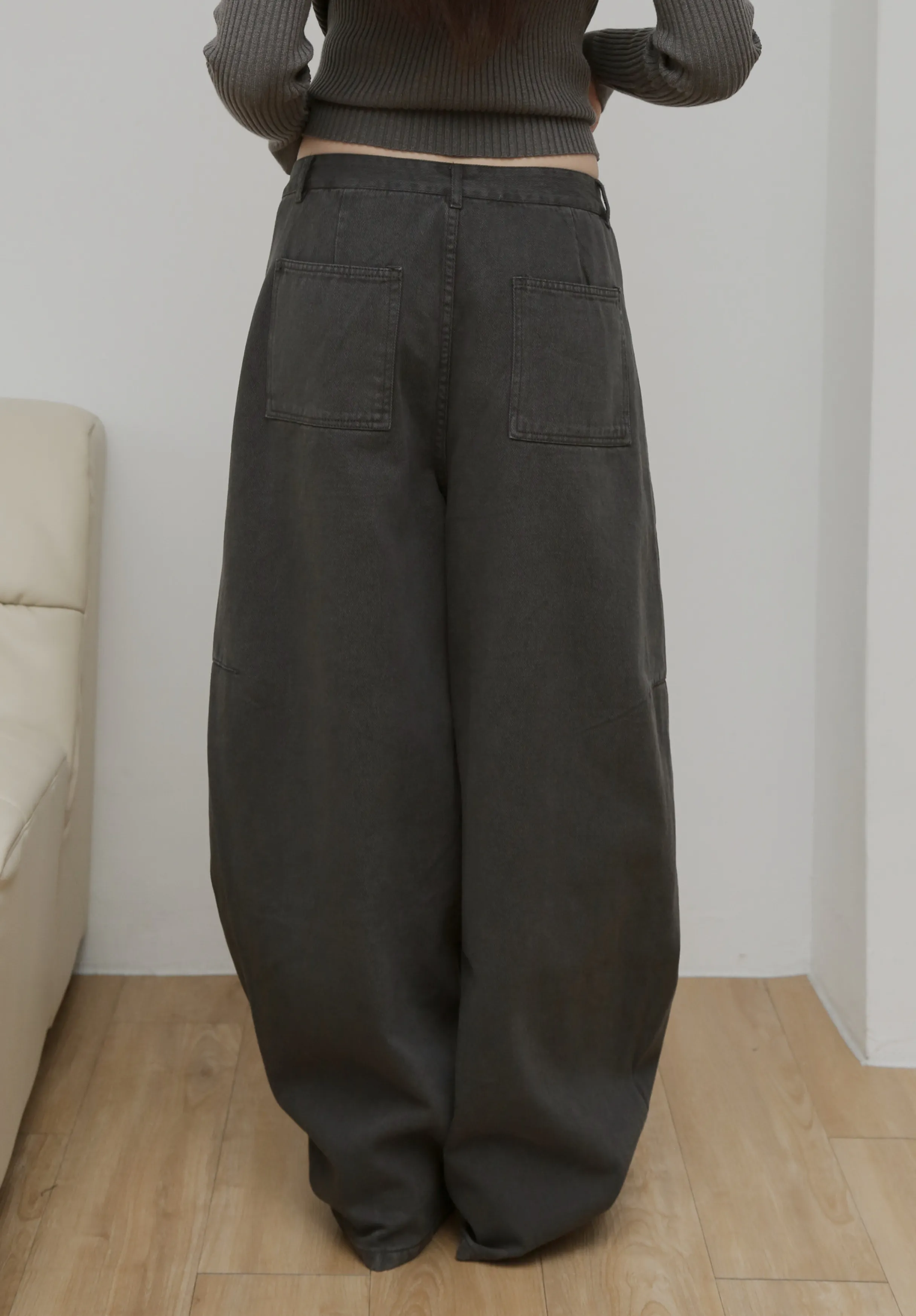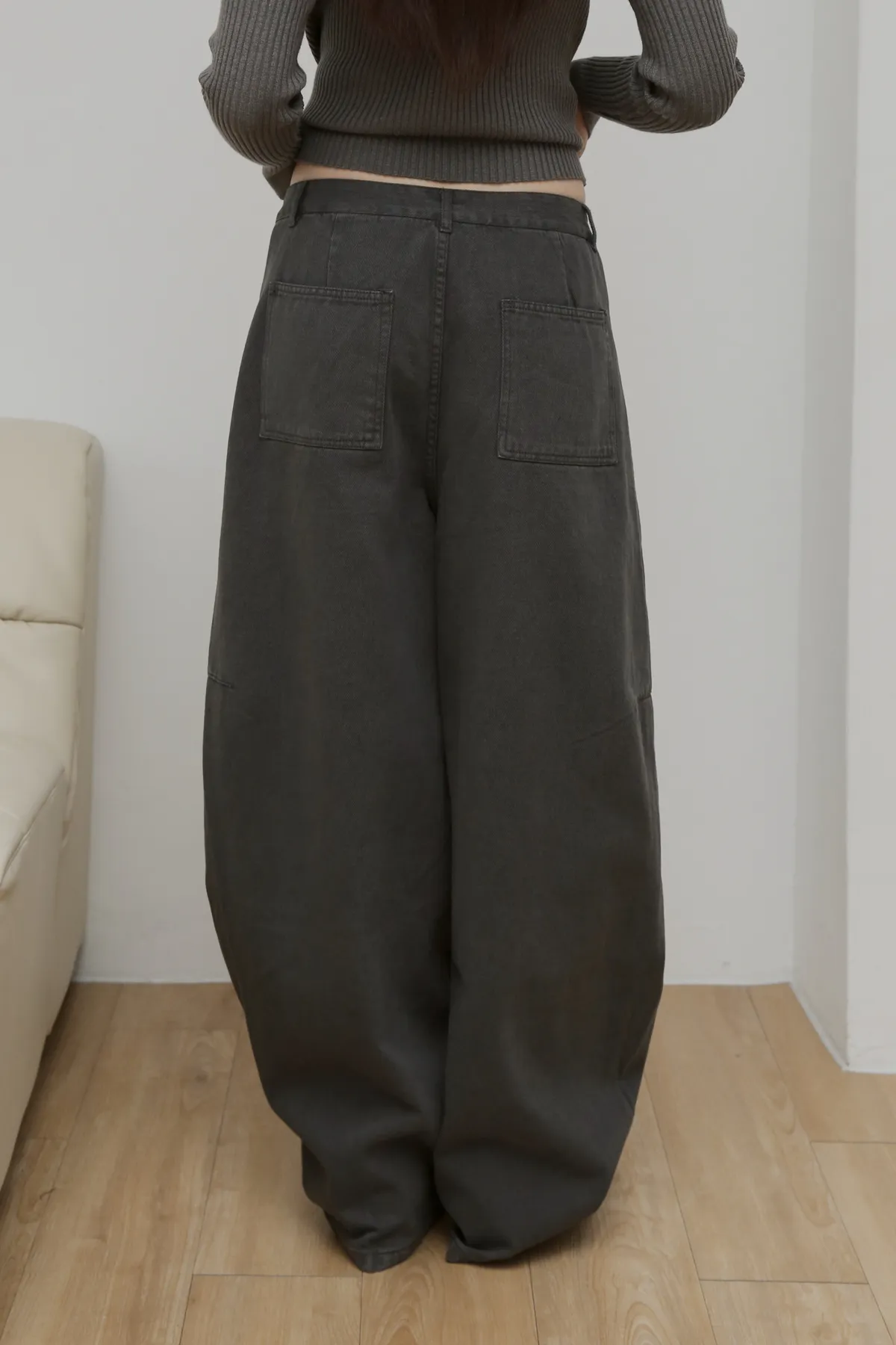 版型上屬於低腰闊腿 褲腿後側做了收縮剪裁
