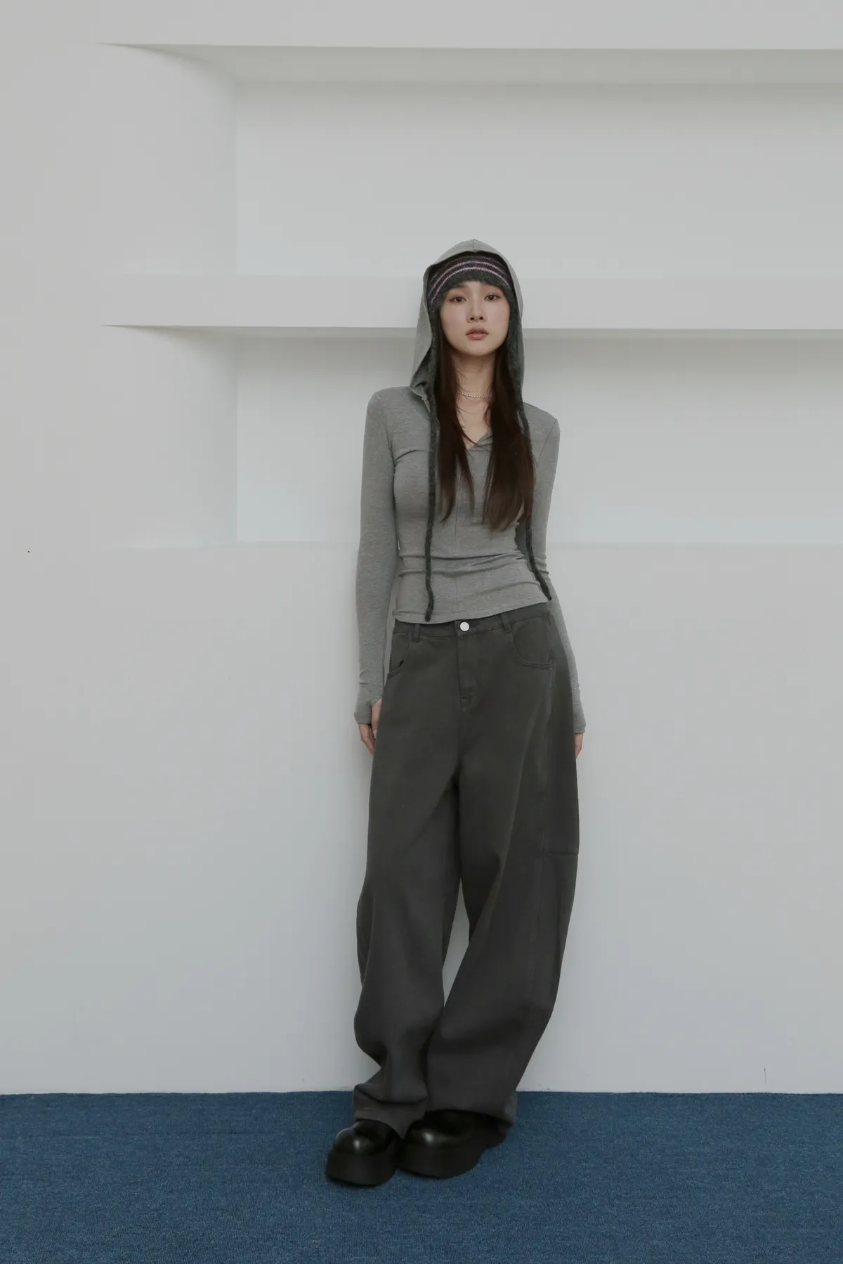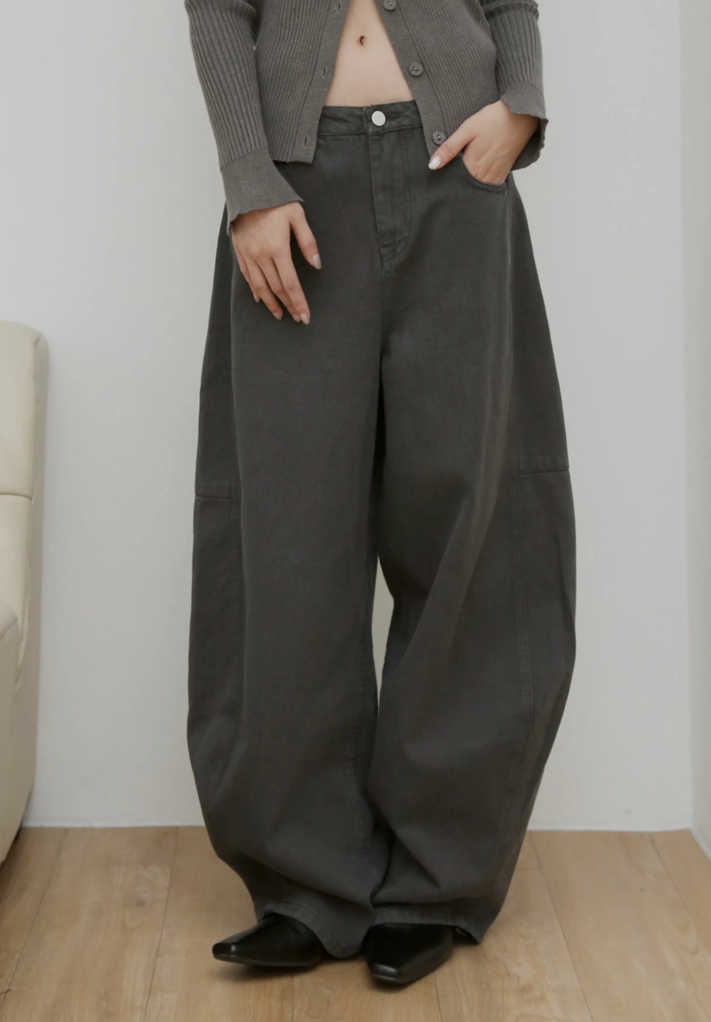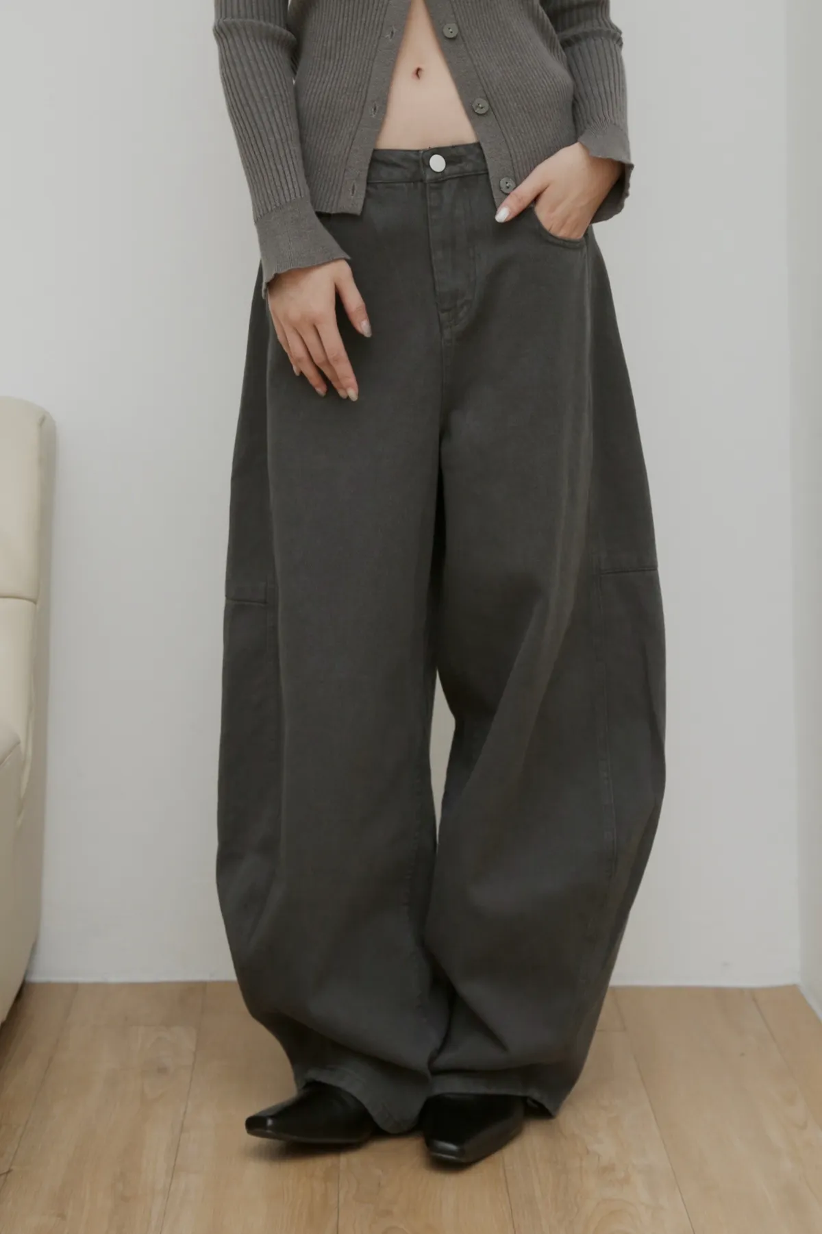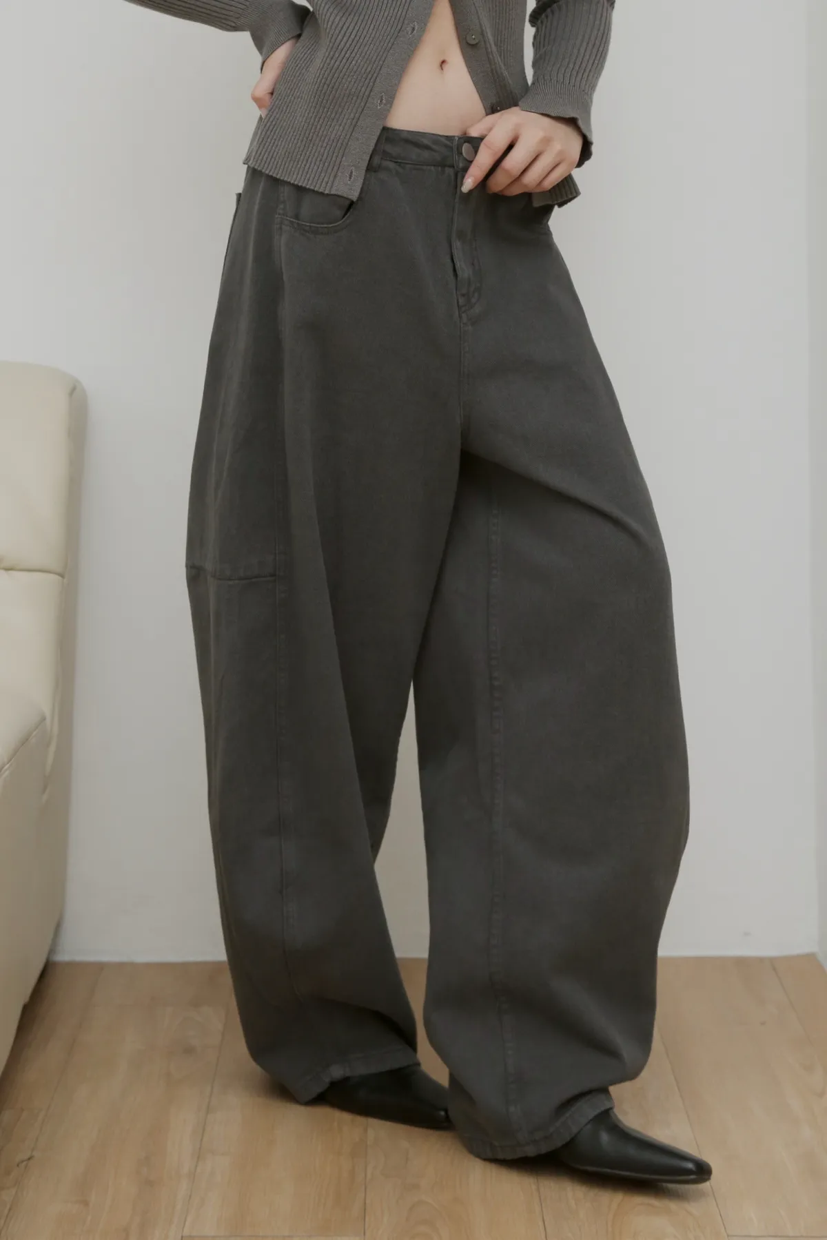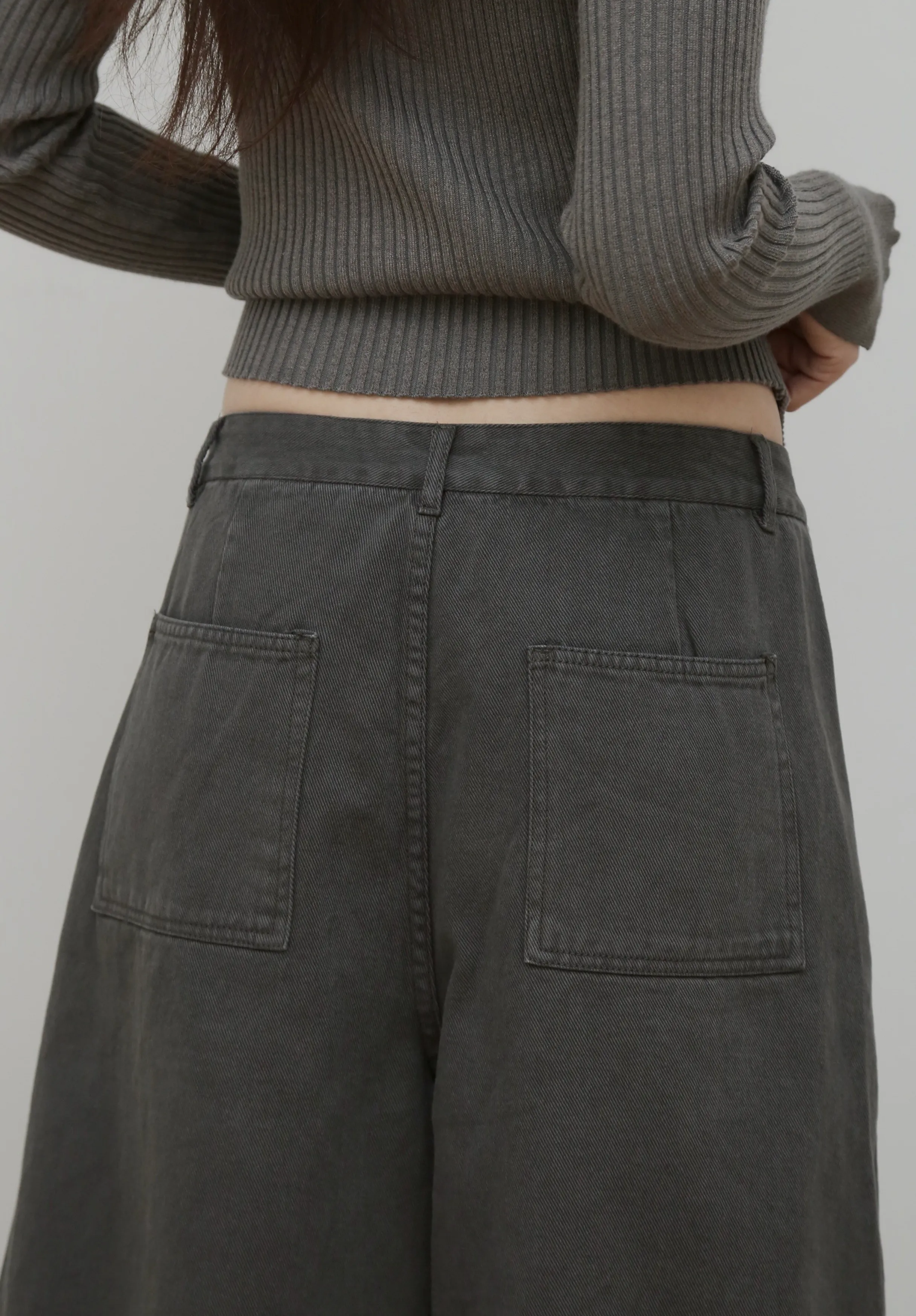 版型上屬於低腰闊腿 褲腿後側做了收縮剪裁