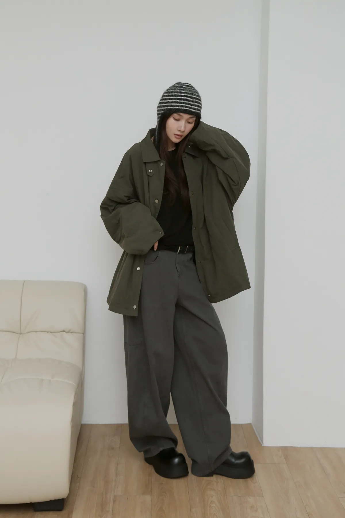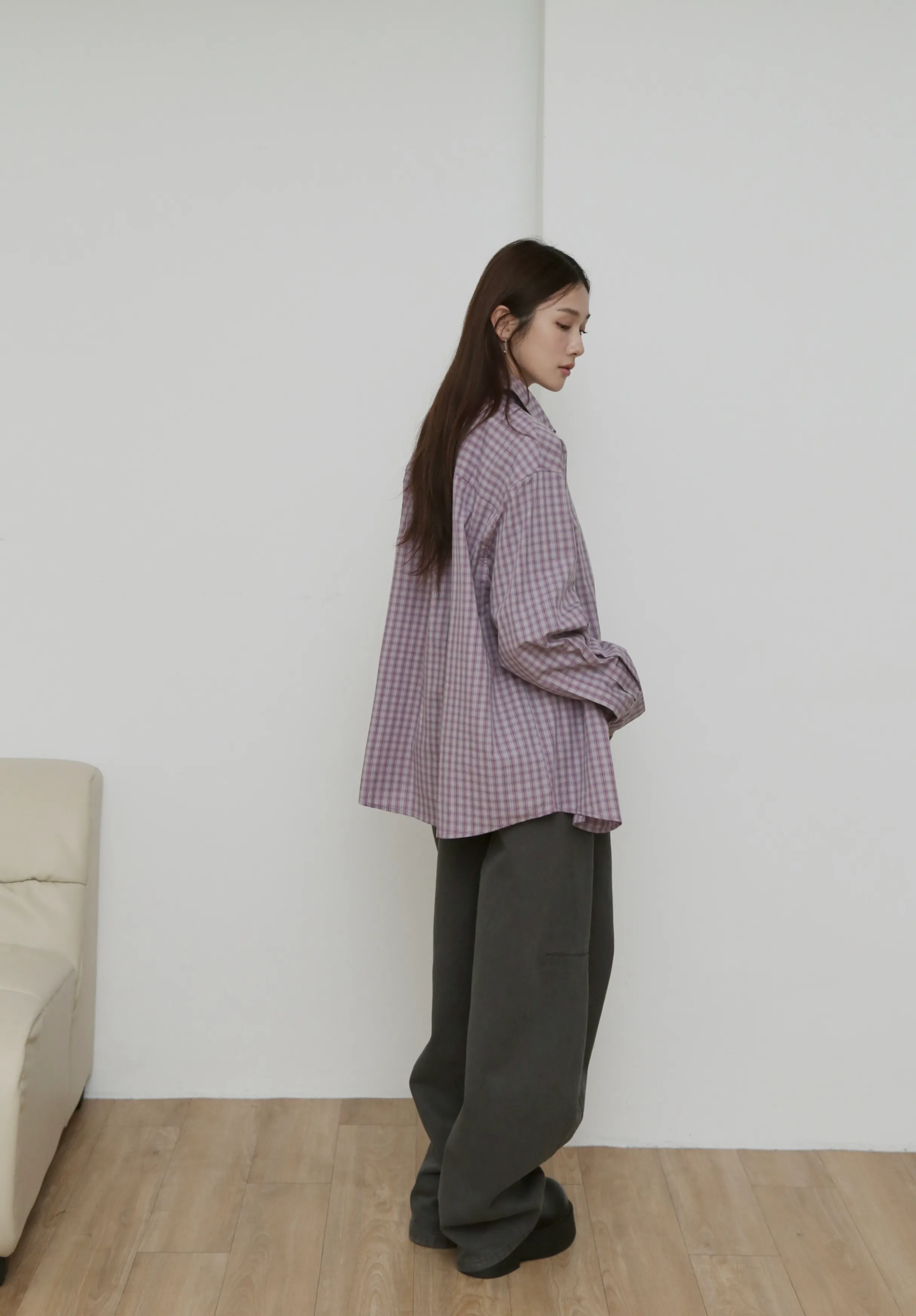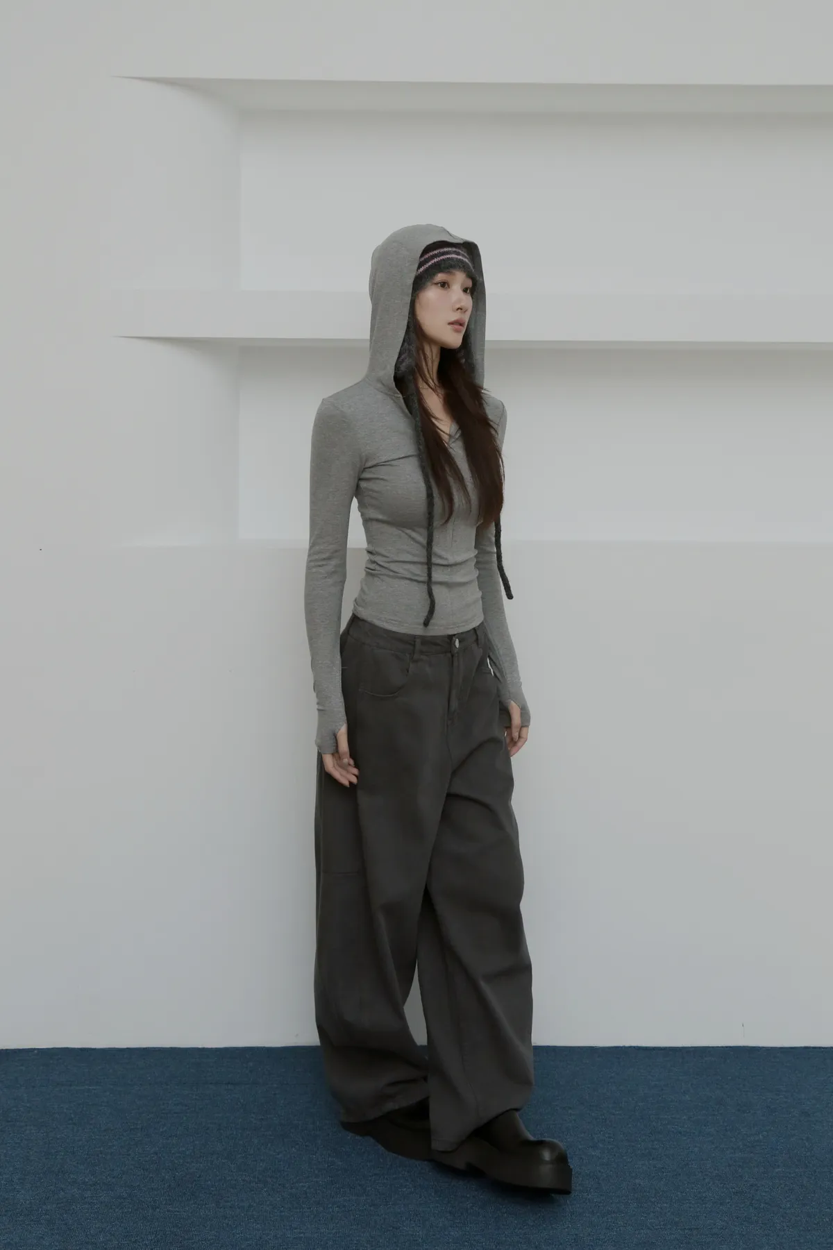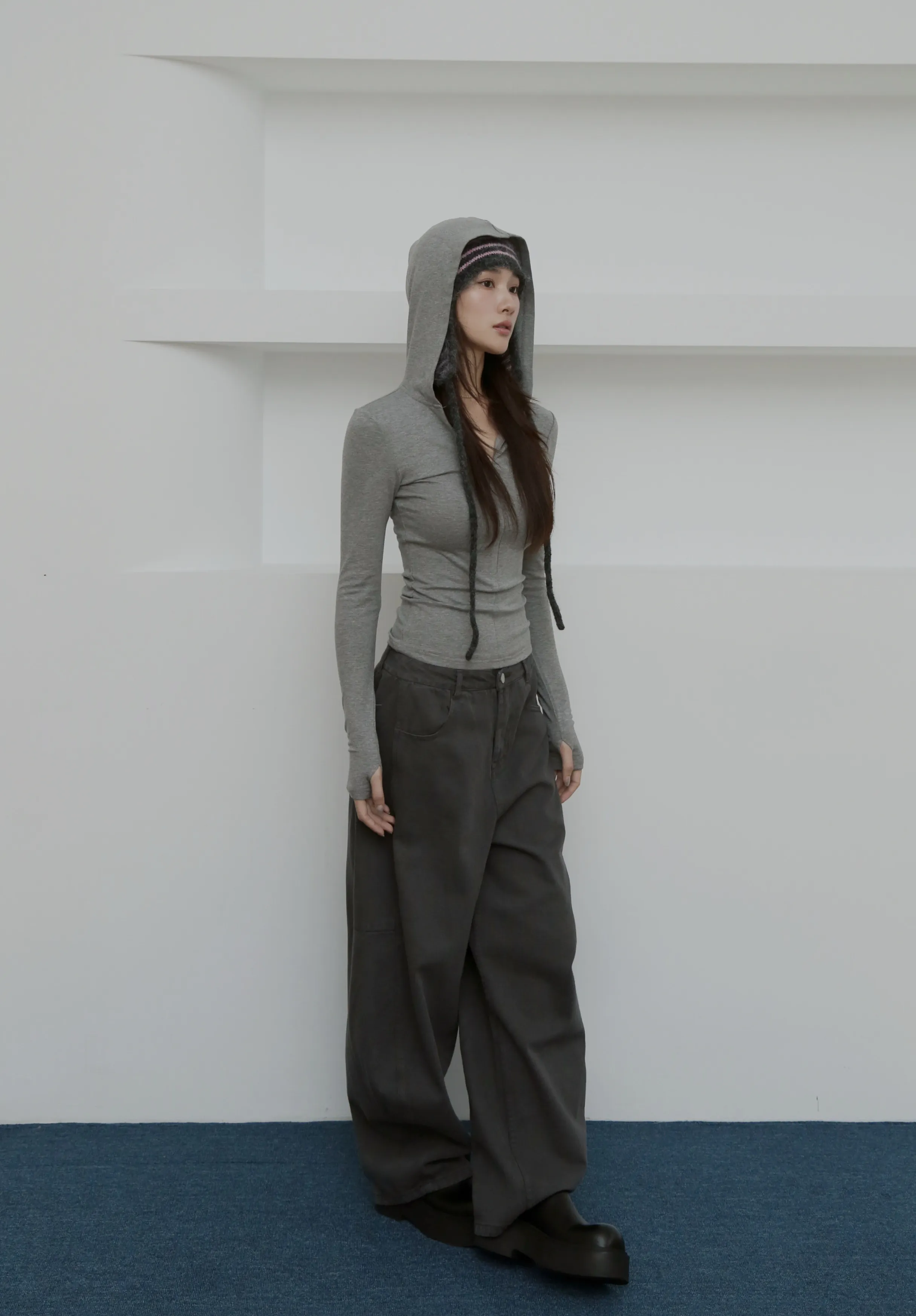 版型上屬於低腰闊腿 褲腿後側做了收縮剪裁