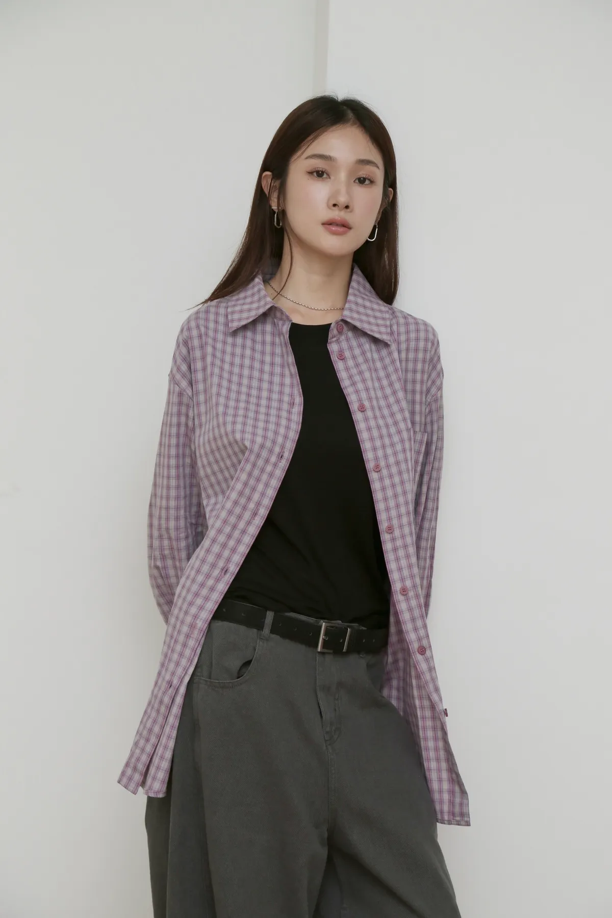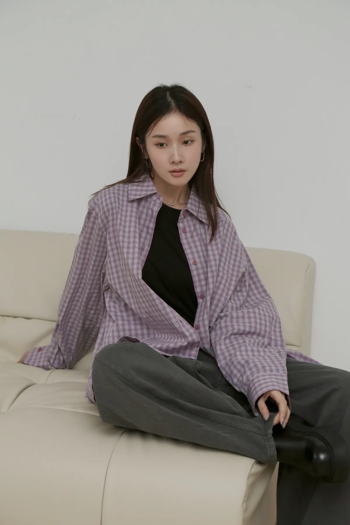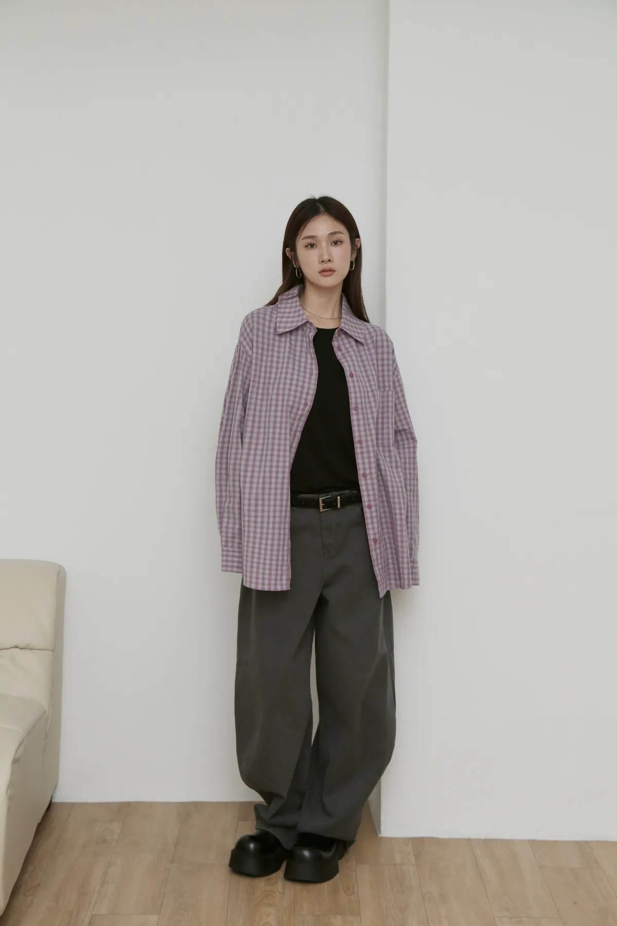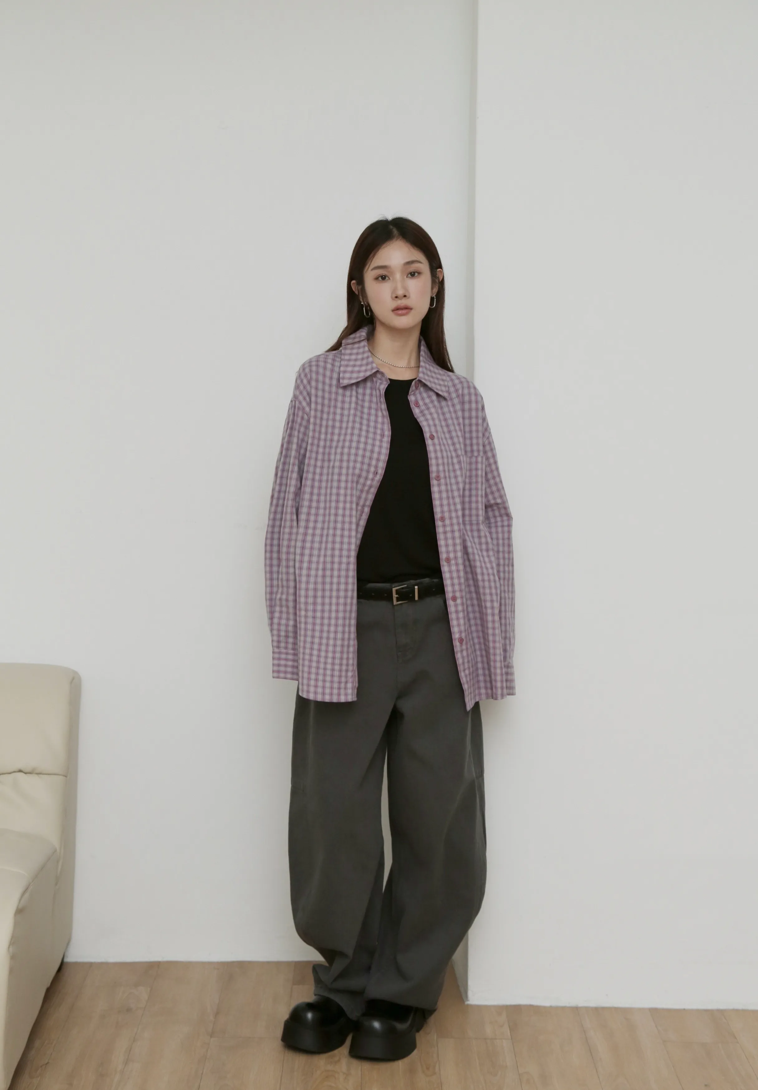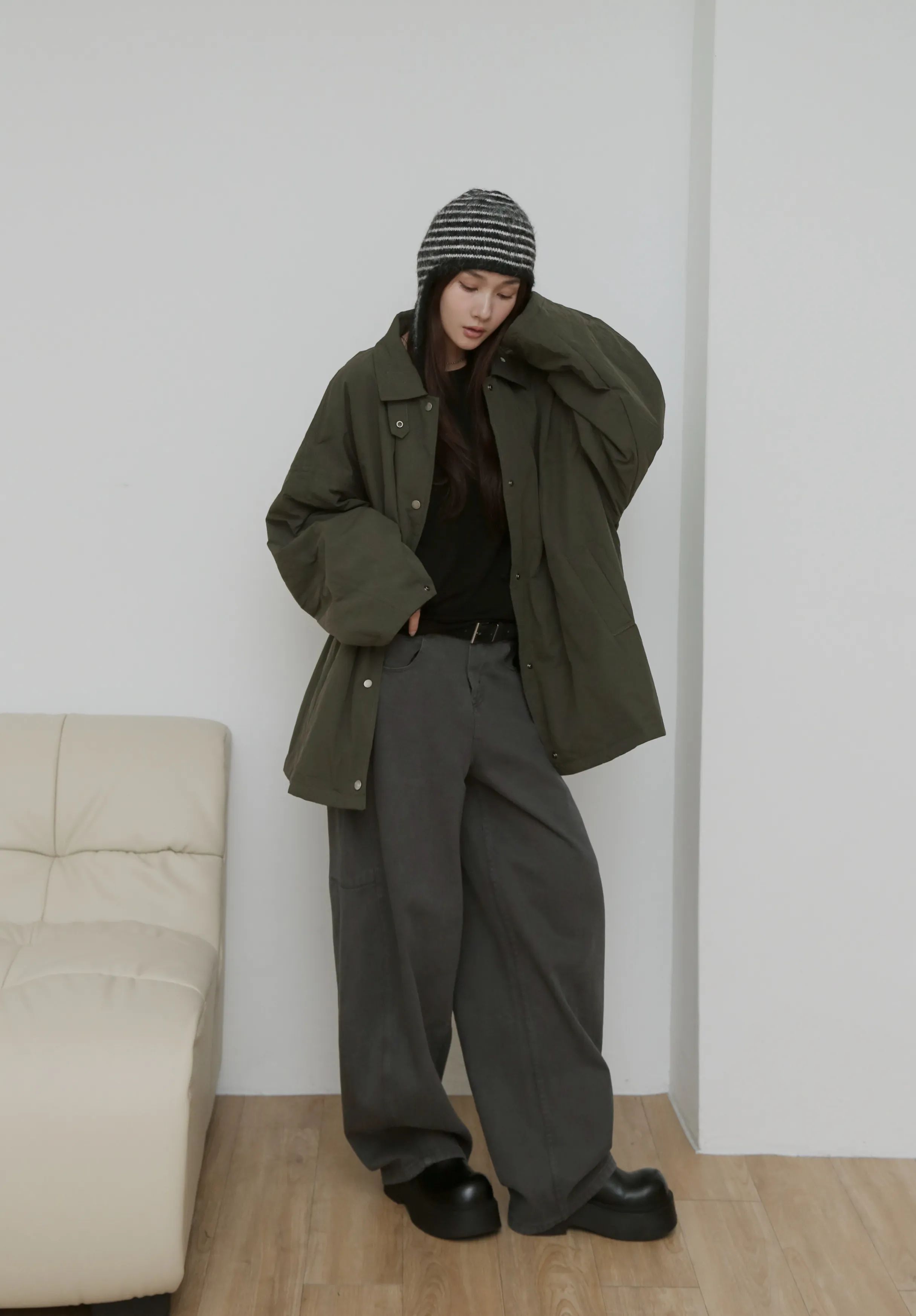 版型上屬於低腰闊腿 褲腿後側做了收縮剪裁