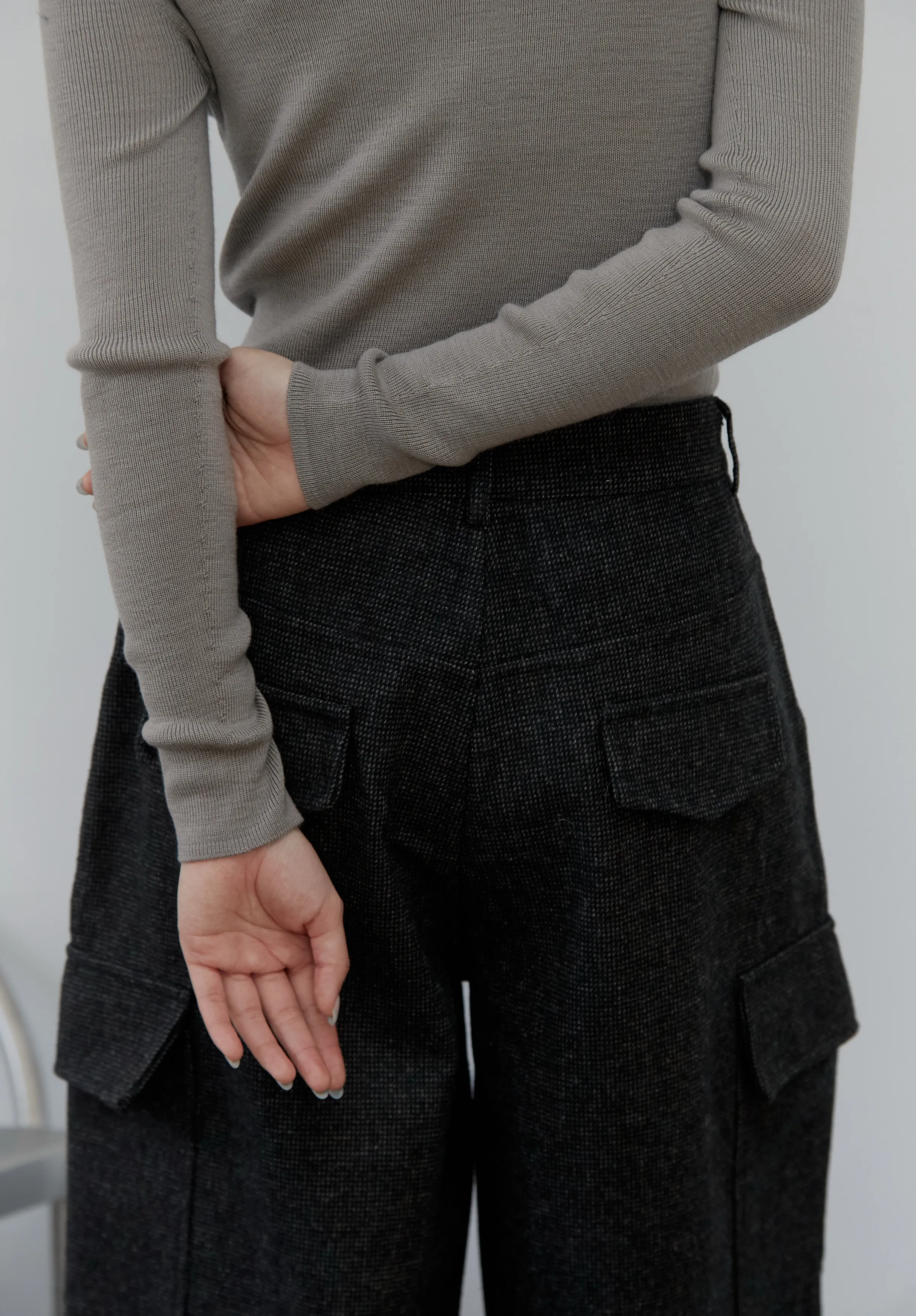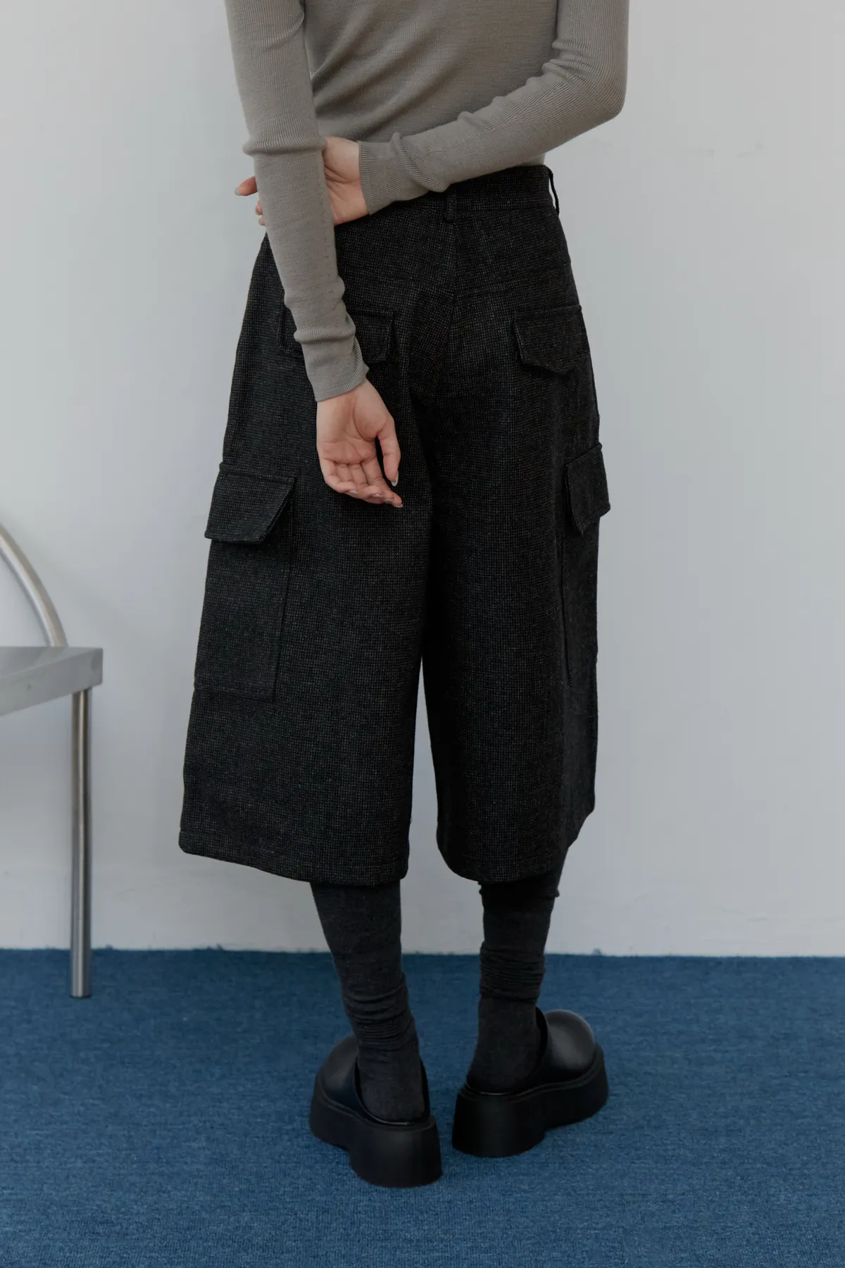 有別常見的七分長度,這件是窄直筒的八分版型